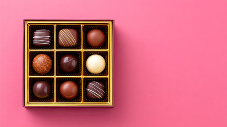 Delight in this elegant assortment of gourmet chocolates artfully displayed in a decorative box against a vibrant pink backdrop. Perfect for gifting or personal indulgence.