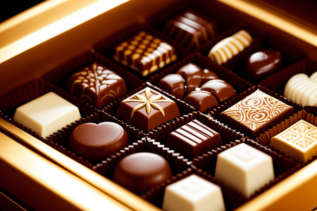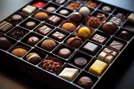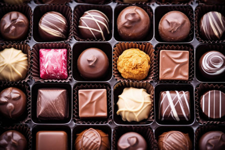 detailed shot of luxury chocolates arranged in box, created with generative ai
