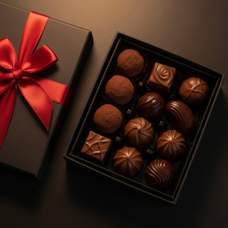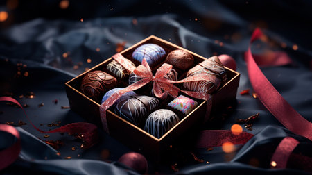 A luxurious box of chocolate truffles adorned with a ribbon, featuring rich dark colors and exquisite detail.