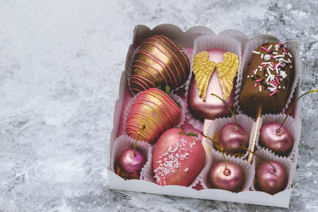 Chocolate Cherry. Chocolate banana with decorative sprinkles. Chocolate covered strawberries. Handmade Dessert in Belgian Chocolate