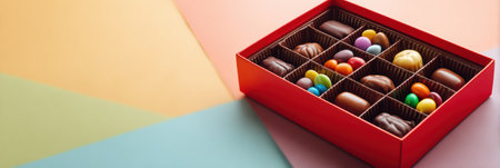 A half-open chocolate gift box displays a variety of sweets, with a soft pastel area on the left for a custom message.