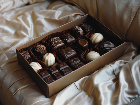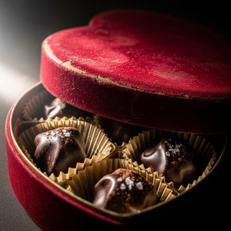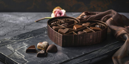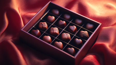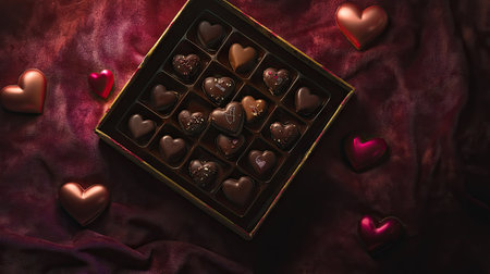 A flat lay of a Valentine chocolate box with chocolates spilling out, set on a soft velvet surface with heart-shaped accents and subtle lighting