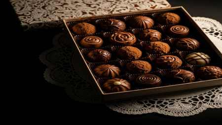 Box of assorted, unwrapped gourmet chocolates (truffles and creams) presented on a lace doily. Cinem