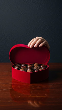 A woman holding a heart shaped box of chocolates on marble, AI
