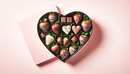 Heart-shaped box filled with an assortment of gourmet chocolates and chocolate-dipped strawberries presents an enticing treat. The strawberries, adorned with swirls of white and dark chocolate, nestle alongside rich, velvety chocolates, each with its own unique design, symbolizing affection and luxury.