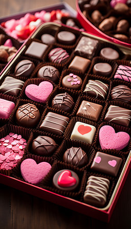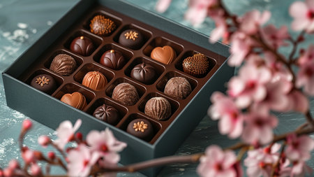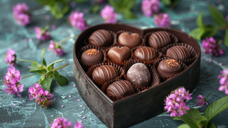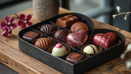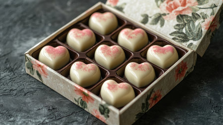This exquisite image showcases assorted heart-shaped chocolates elegantly arranged in a beautifully designed floral box, perfect for gifts and celebrations.