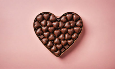 A heart-shaped box filled with chocolate candies sits on a pink background