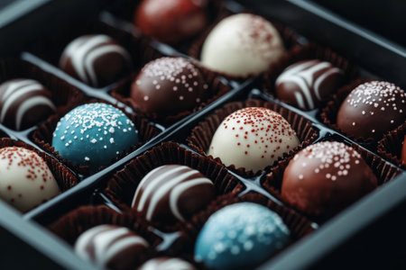 This image showcases an elegant arrangement of gourmet chocolate truffles in a colorful gift box, perfect for special celebrations or sweet moments.