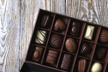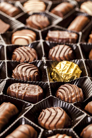 Box of assorted chocolates, close-up. Selective focus.