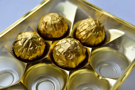 Chocolate candies in a box in a gold wrapper