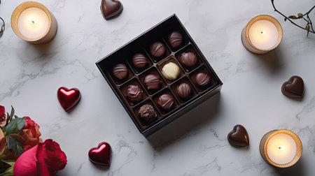 A Valentine chocolate box with a glossy finish, opened to display smooth, artisan chocolates in a perfect arrangement, surrounded by candles