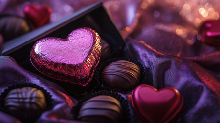 A luxury Valentine chocolate box with a metallic finish, positioned on a plush velvet surface with soft ambient lighting.