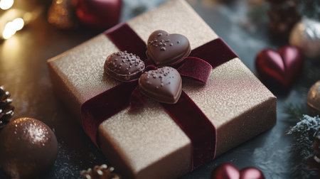 A close-up of a luxury Valentine chocolate gift box with a velvet ribbon, surrounded by soft lighting and decorative heart-shaped ornaments.