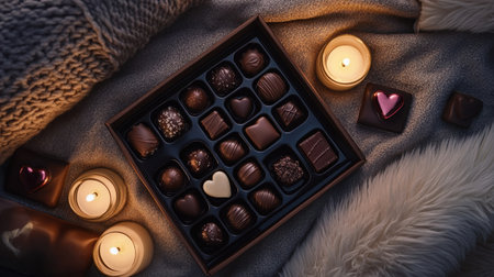 A top-down shot of a Valentine chocolate gift box with assorted chocolates, surrounded by a cozy setting of candles and plush cushions.