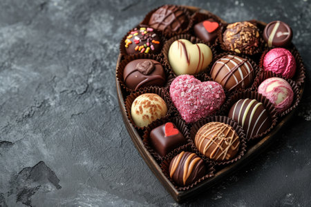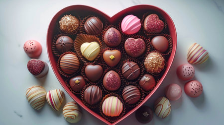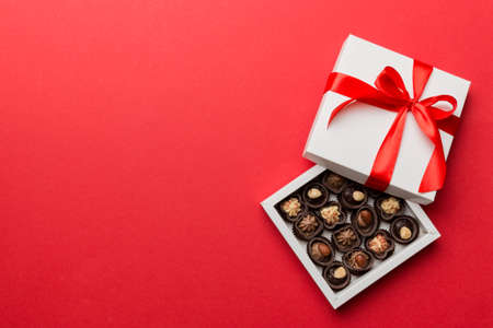 Delicious chocolate pralines in red box for Valentine's Day. Heart shaped box of chocolates top view with copy space.