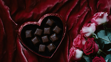 A heart-shaped box of chocolates and a bouquet of roses on a velvet background
