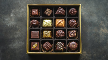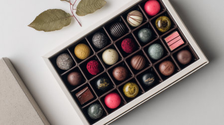 A beautifully arranged box of assorted chocolates showcasing a variety of textures and flavors, perfect for gifting or indulging in a sweet treat.