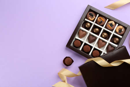 Different delicious chocolate candies in box and ribbon on lilac background, flat lay. Space for text