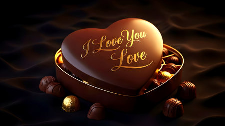 A beautifully crafted heart-shaped chocolate box filled with assorted chocolates, featuring a romantic 'I Love You Love' message on the lid.