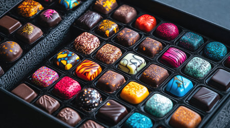 Gift box filled with colorful artisan chocolates, decorated with intricate patterns and textures. A perfect present for chocolate lovers.
