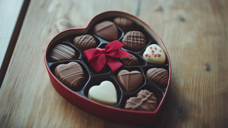 A heart shaped box filled with various chocolates sits on a rustic wooden table. The box features a bright red ribbon, adding a touch of elegance to the sweet assortment.