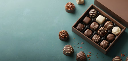 A beautifully arranged chocolate gift box featuring assorted chocolates on a serene turquoise background. The atmosphere is luxurious and inviting, perfect for gifting.