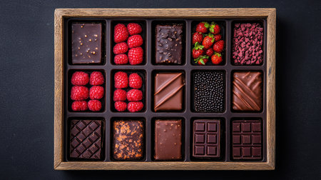 This image showcases a luxurious gourmet chocolate box filled with a variety of chocolates and fresh berries, perfect for dessert lovers and gift occasions.