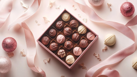 Delight in a beautifully crafted assortment of gourmet chocolates nestled in a festive box, perfect for sharing during holiday gatherings. The soft colors and decorative ribbons enhance its charm.