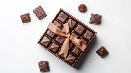 A beautifully wrapped chocolate gift box with a ribbon, placed on a clean white surface, showcasing an elegant and thoughtful gift option.