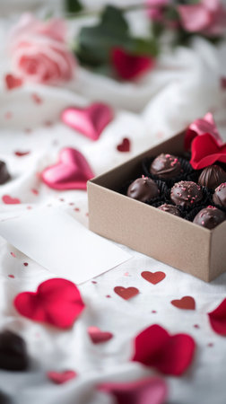 A realistic image of a Valentine's Day gift box, with chocolates, a love note and rose petals, arranged on a white tablecloth adorned with heart-shaped confetti for a festive touch