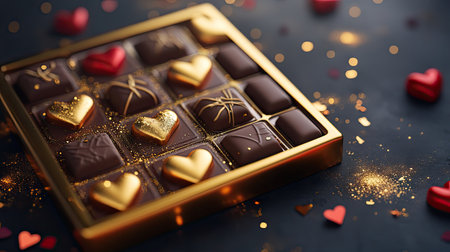 A luxurious Valentine's Day chocolate gift set with golden packaging and decorative heart motifs
