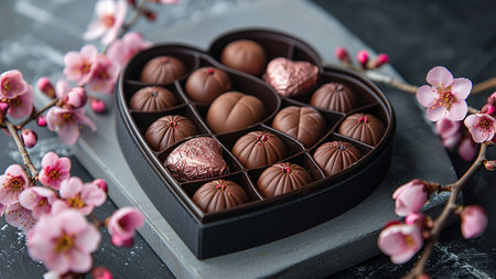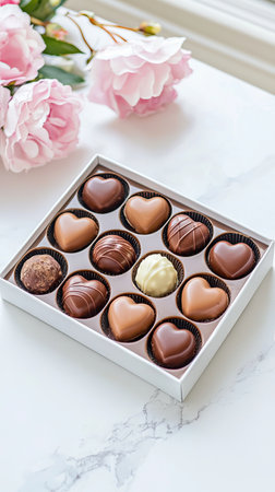 Box of Gourmet Heart-Shaped Chocolates with Pink Peonies on Marble Surface. Concept of Romance, Luxury Gifting, Sweet Indulgence, and Celebratory Treats. Valentine's Day. Vertical.