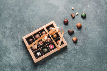 Chocolates in different shapes and colors in gift box on wooden table. Flat lay. Top view