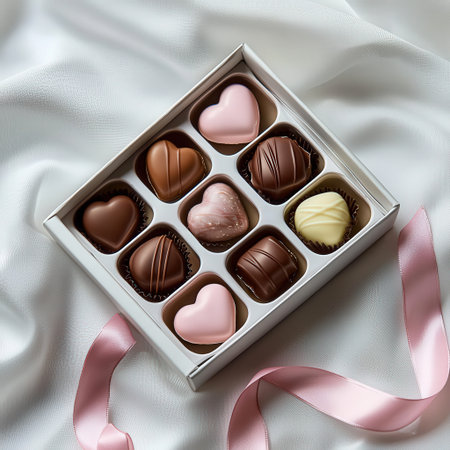 A box of heart-shaped chocolates tied with a pink satin ribbon, displayed on a white backdrop