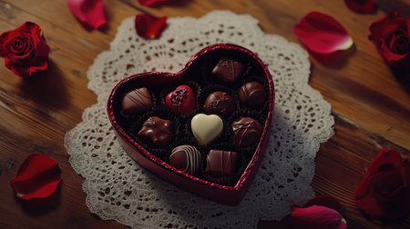 A heart-shaped box of assorted chocolates placed on a lace doily, with rose petals scattered around on a wooden surface.