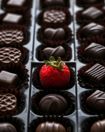 An AI generated illustration of A single ripe strawberry paired with a selection of delectable chocolates and a box of assorted candies