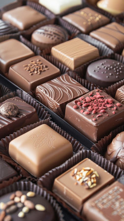 A beautifully arranged selection of assorted chocolates showcases various flavors and textures, perfect for indulging at a special gathering or celebration.