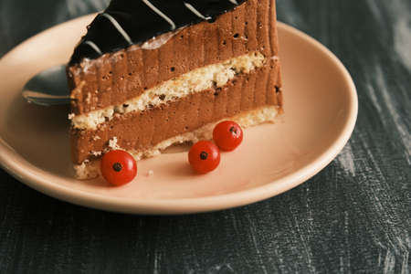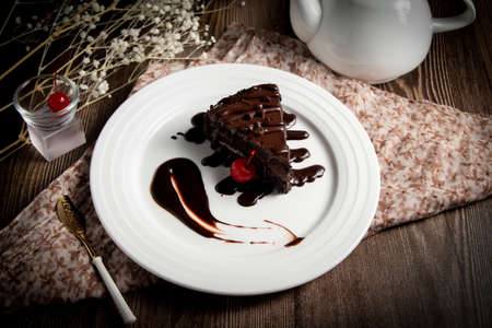 Dark chocolate cake slice on wooden table