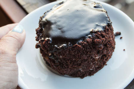 Chocolate cake with icing lies on a plate, a womans hand holding a plate