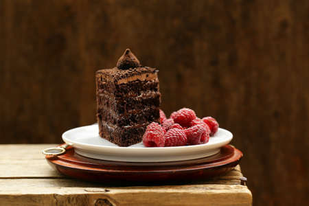 Chocolate cake with raspberries on a plate on a wooden table