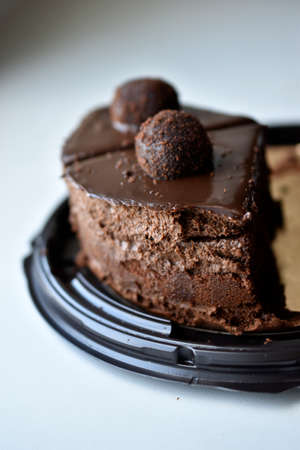 Slice of delicious chocolate cake. Piece of Cake on a white Plate. Sweet food. Sweet dessert. Close up. Selective focus.