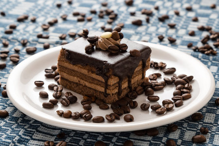 chocolate cake and coffee beans on white plate