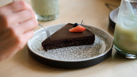 Close-up of hand of young woman breaks off piece of tasty chocolate cake at coffee shop