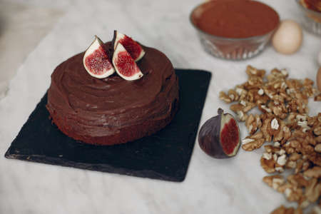 Confectioner decorates a chocolate cake with figs.