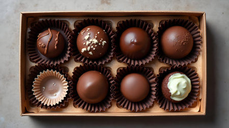 A high angle closeup shot of chocolate bonbon candies in brown box packaging