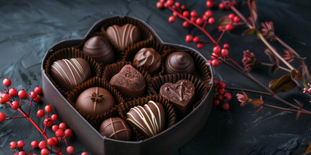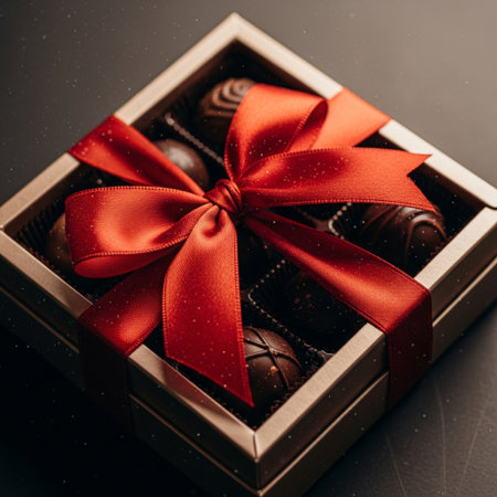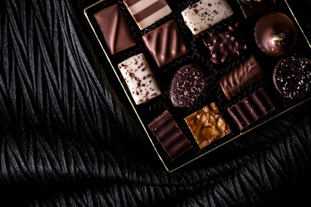 Elegant assortment of gourmet chocolates in a luxurious gift box, displayed with a ribbon. Selective focus on rich textures and glossy surfaces.