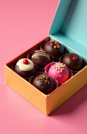 Gourmet chocolate truffles with various toppings and colors are neatly arranged in a partially opened gift box, creating a visually appealing presentation against a vibrant pink backdrop
