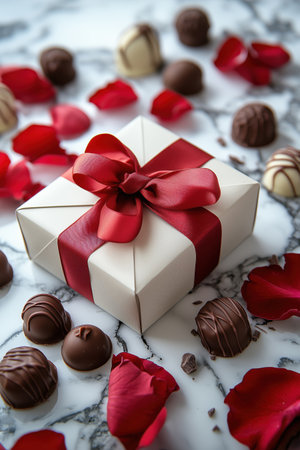 A beautifully wrapped gift box tied with a satin ribbon, surrounded by chocolate truffles and rose petals.