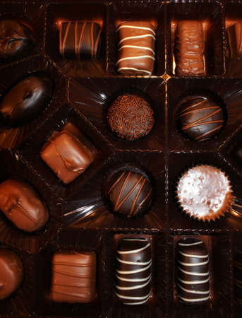 Dark bitter chocolate candies in a box. Dessert is candy. Luxury sweet assortment.