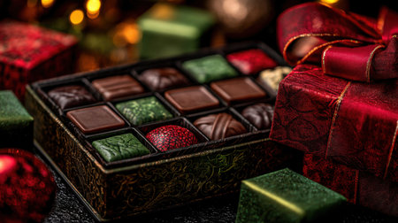 A beautifully arranged box of assorted chocolates surrounded by festive decorations, perfect for gifting or indulging in luxury by Generative AI